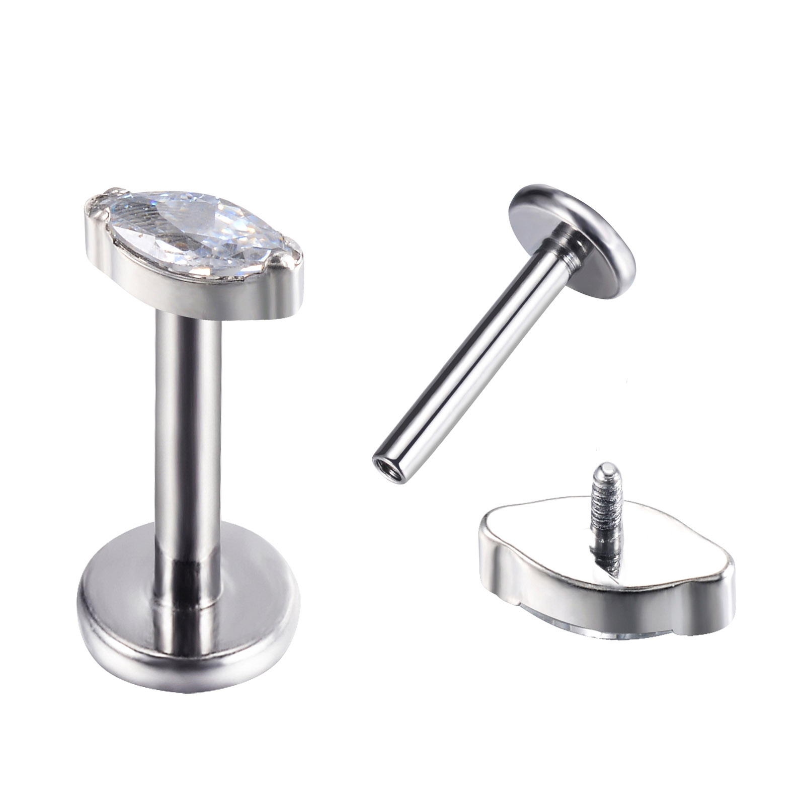 A refined titanium top featuring two marquise-cut CZ stones paired with a round CZ accent, CNC-set for clean sparkle and secure internally threaded wear.